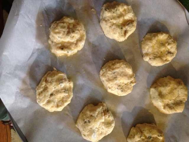 Pre-heat Oven to 425 degrees.  Mix flour, baking powder, baking soda & salt.  Cut 6 tablespoons of cold butter into the flour mixture until it resembles coarse meal.  Stir in buttermilk.  Place dough by ice-cream scoop size lumps onto a parchment lined baking sheet. Brush with a little melted butter. Bake 10 – 15 minutes until tops are golden.